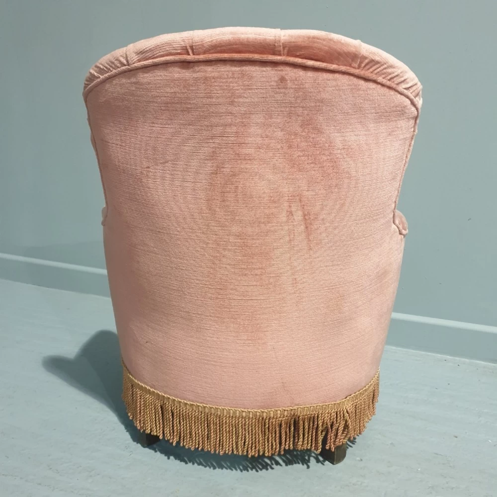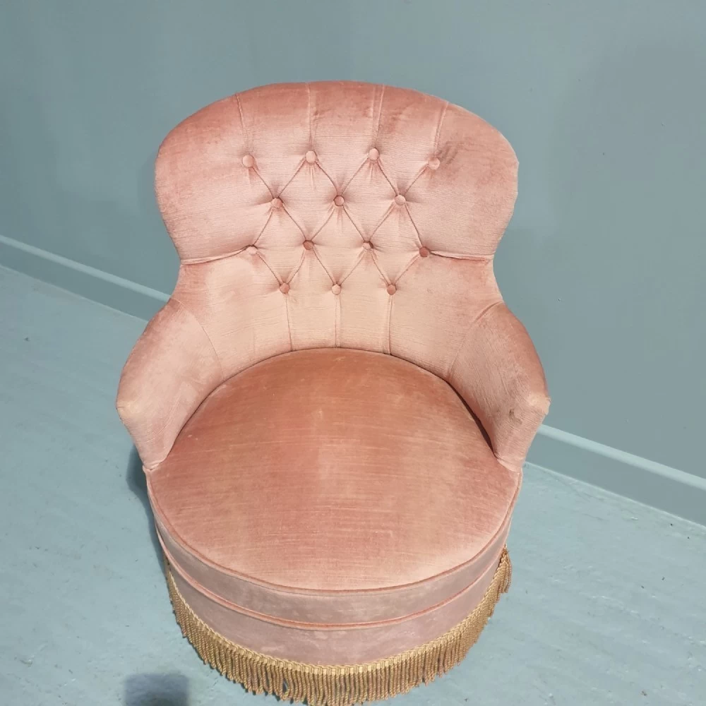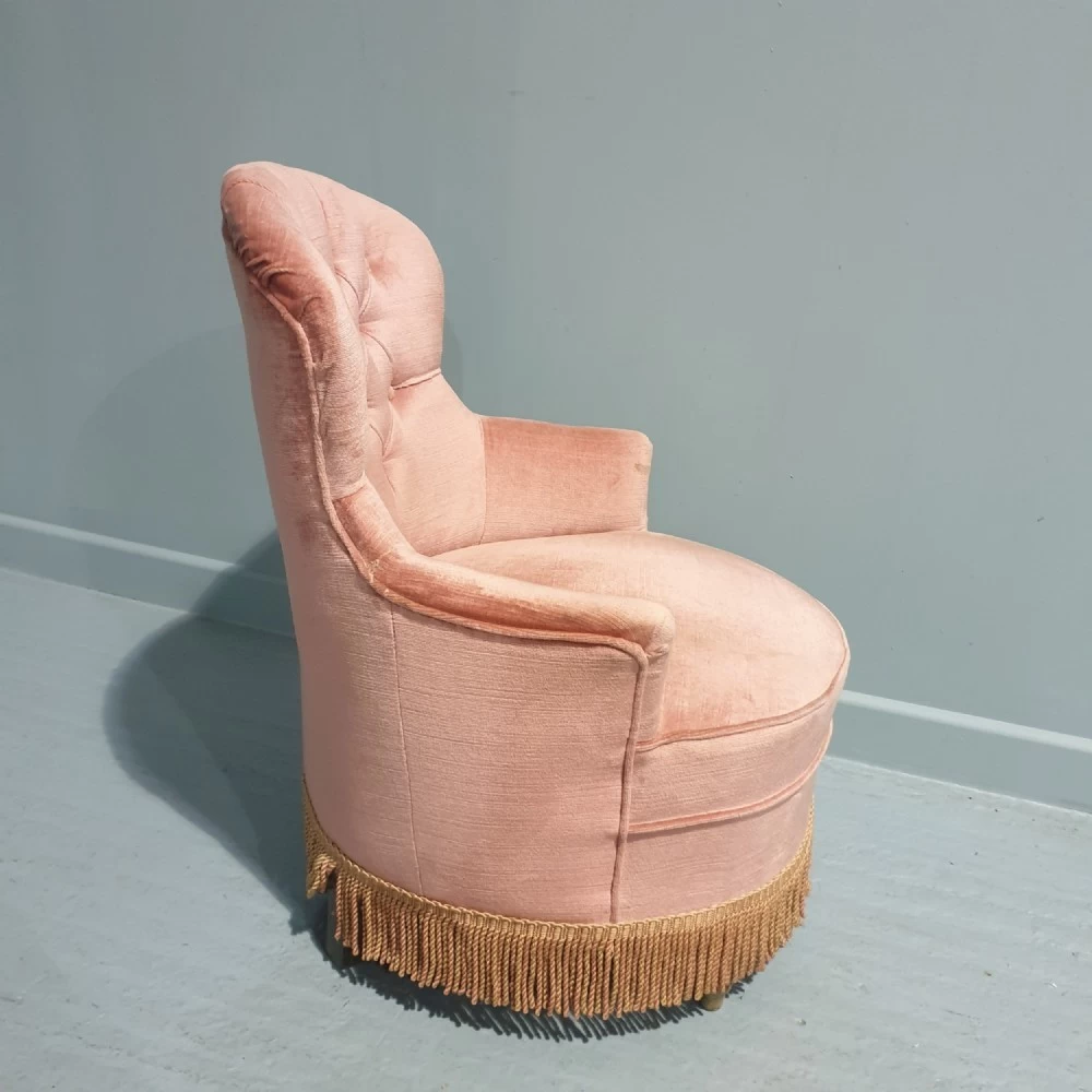 A very nice deep pleated circular boudoir bedroom chair with deep bullion fringing, standing on turned legs.