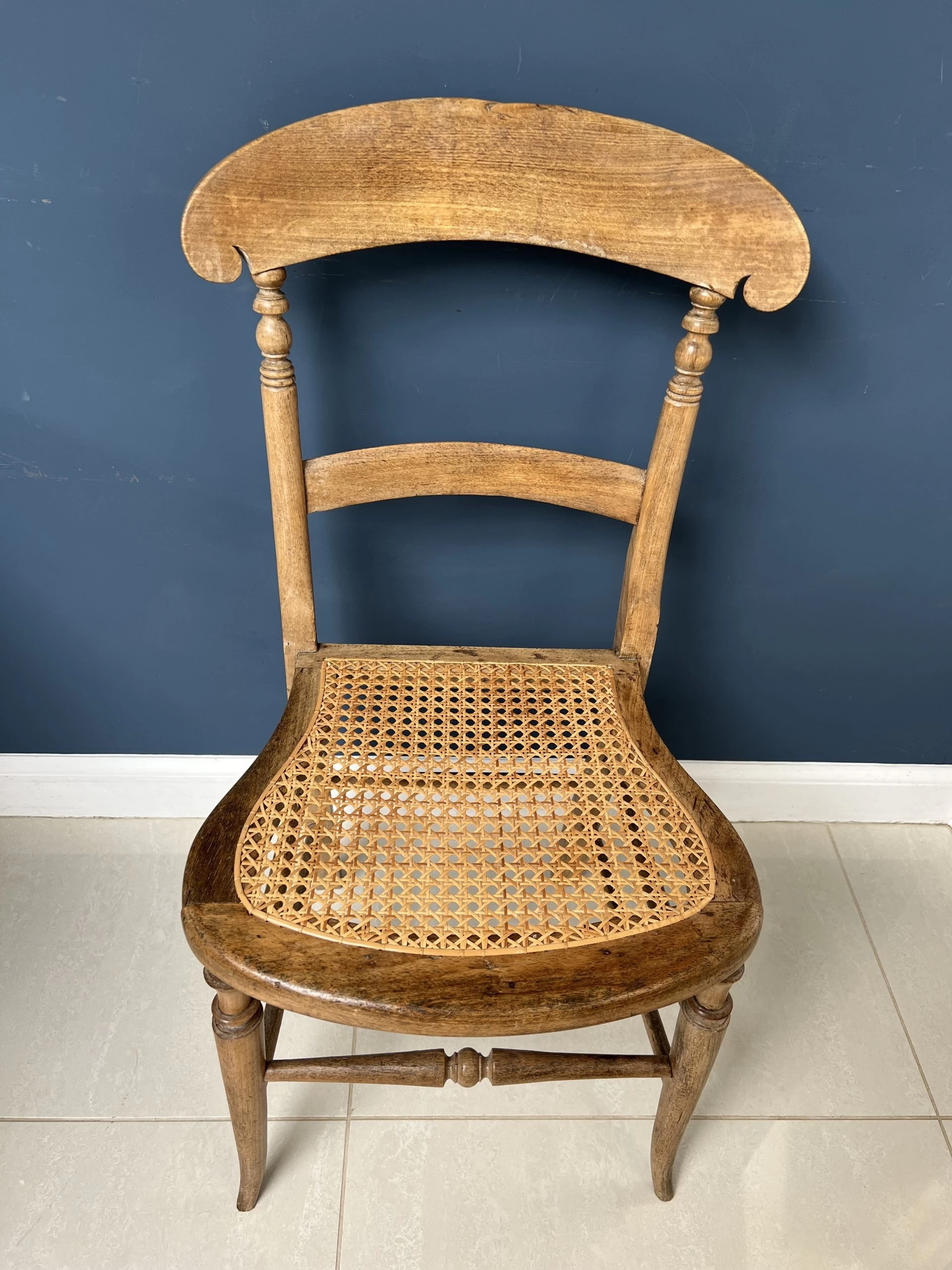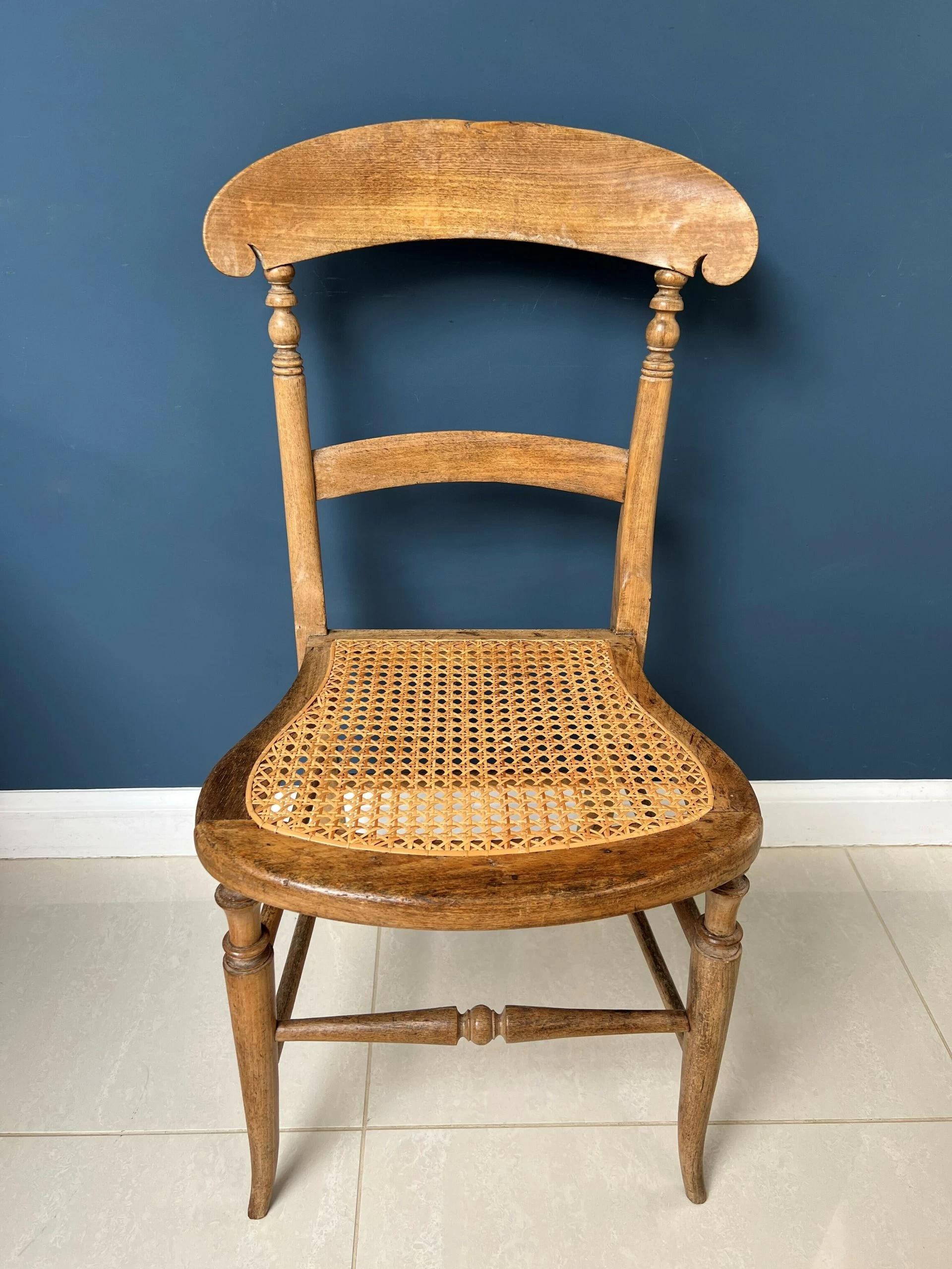Victorian wood framed chair with shaped back rest, hand turned front stretcher and spindles and an excellent condition cane seat. Dated 1850-1880.